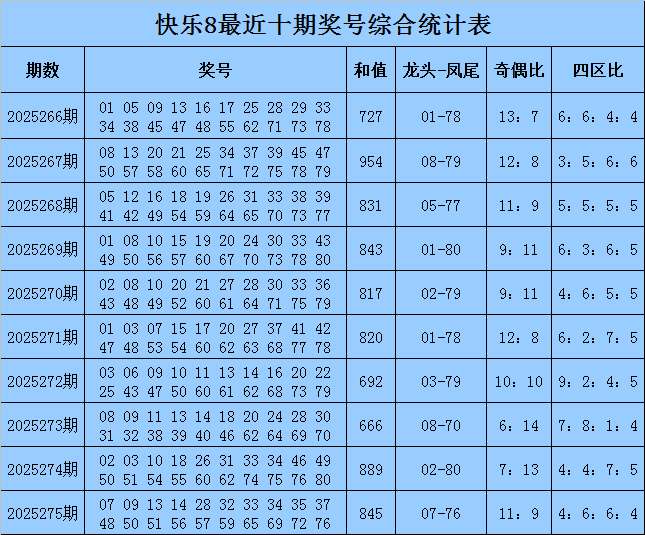 福彩快乐8第2025275期开奖回顾:07 09 13 14 28 32 33 34 35 37 48 50 51 56 57 59 65 69 72 76,其中奖号和值为845,跨度为69,奇偶比开出11:9,012路比开出7:6:7,四区比开出4:6:6:4。